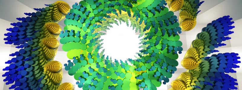 少しずつずれたタイミングで円運動と時折急速な角度変更をする複数の筒状のシェイプレイヤー。 |